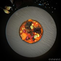 - Geräuchertes Paprikapulver, Thymian (oder Oregano/Rosmarin) und eine Prise Cayennepfeffer dazu geben, mit Zwiebeln und Karotten gut umrühren. Abgetropfte Bohnen zufügen. Gemüsebrühe einfüllen und etwa 15 Minuten köcheln lassen.