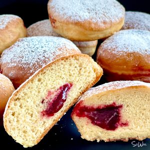Diese hier haben wir vergleichsweise im Öl frittiert und im Backofen gebacken. Beide schmecken super gut und sind schön fluffig. Zum Vergleich zeigen wir euch die Berliner von innen: links ist der gebackene und der rechts ist im Öl frittierte.