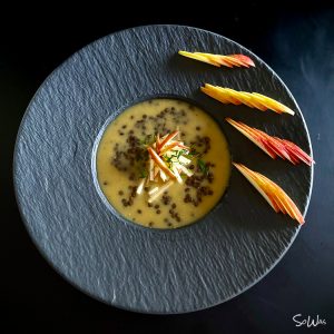 - Die Suppe in die Teller füllen, Beluga Linsen dazugeben und mit Apfeljulienne und Petersilie servieren.