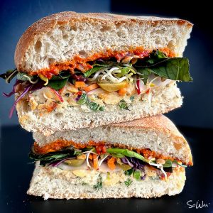 Pikanter Kichererbsensalat, knackige Radieschen und saftiges Rotkraut, dazu noch marktfrischer Salat und etwas Ajvar vereint zu einem geschmacksintensiven Ciabatta-Sandwich.