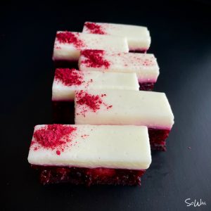 In diese köstliche Schnitte haben wir die Rote Bete untergejubelt Zusammen mit Himbeeren, einem schokoladigen Boden und zarter Panna Cotta Schicht ist es ein leckeres Dessert geworden.