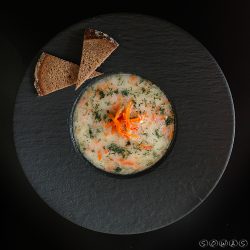 Suppe in die Teller füllen, mit gehacktem Dill und einem Klecks Sahne garnieren.